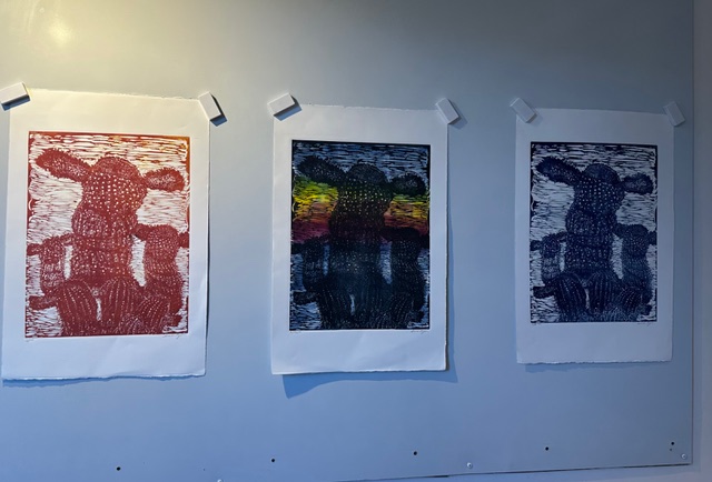 Interspersed along the way my ranch animals show up. Currently, I am working on a series of self-portraits (my style) linocuts.