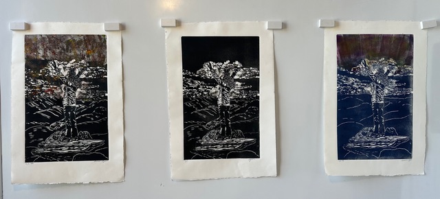 In 2011 my dearest friends persuaded me to join them in exploring printmaking. From that first wood block carving I was hooked. It is both 2 and 3 dimensional. Printmaking has infused new inspiration for endless playful possibilities. Pulling the print off the block is the wonder and excitement akin to opening the kiln door of a glaze fire. There are so many techniques to learn and skills to hone, I will never be done.